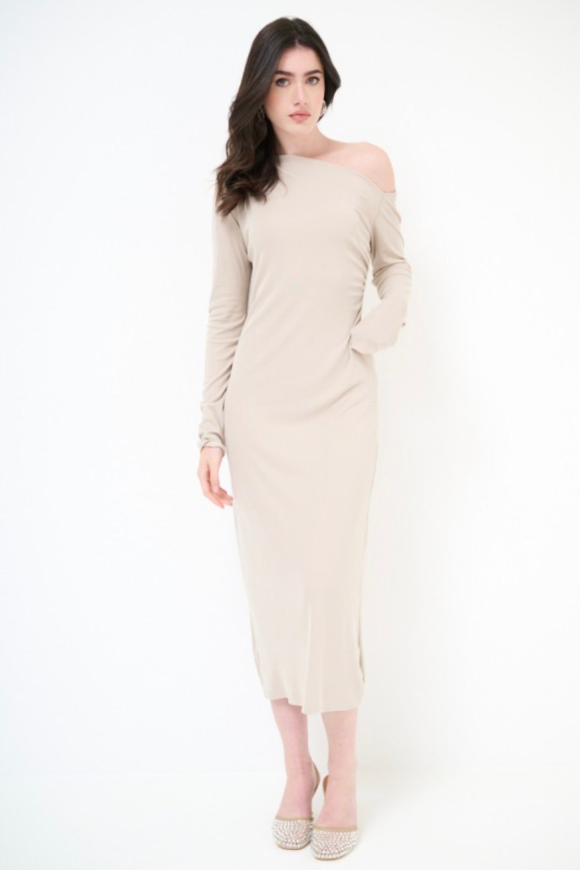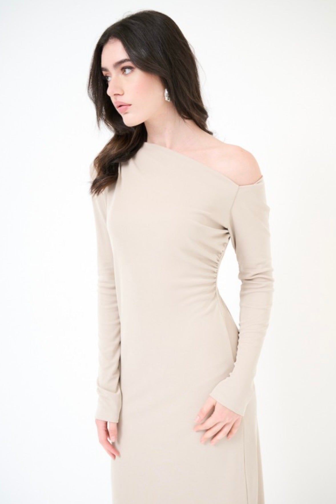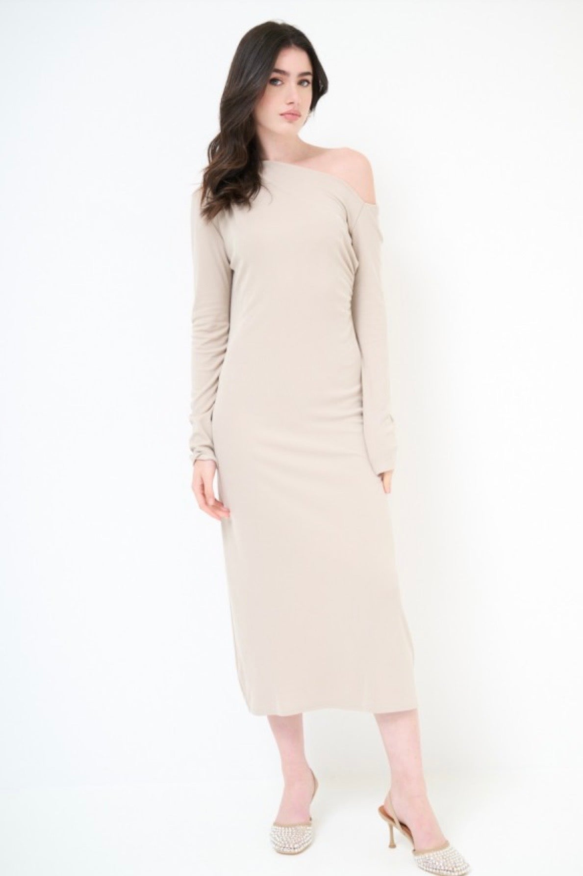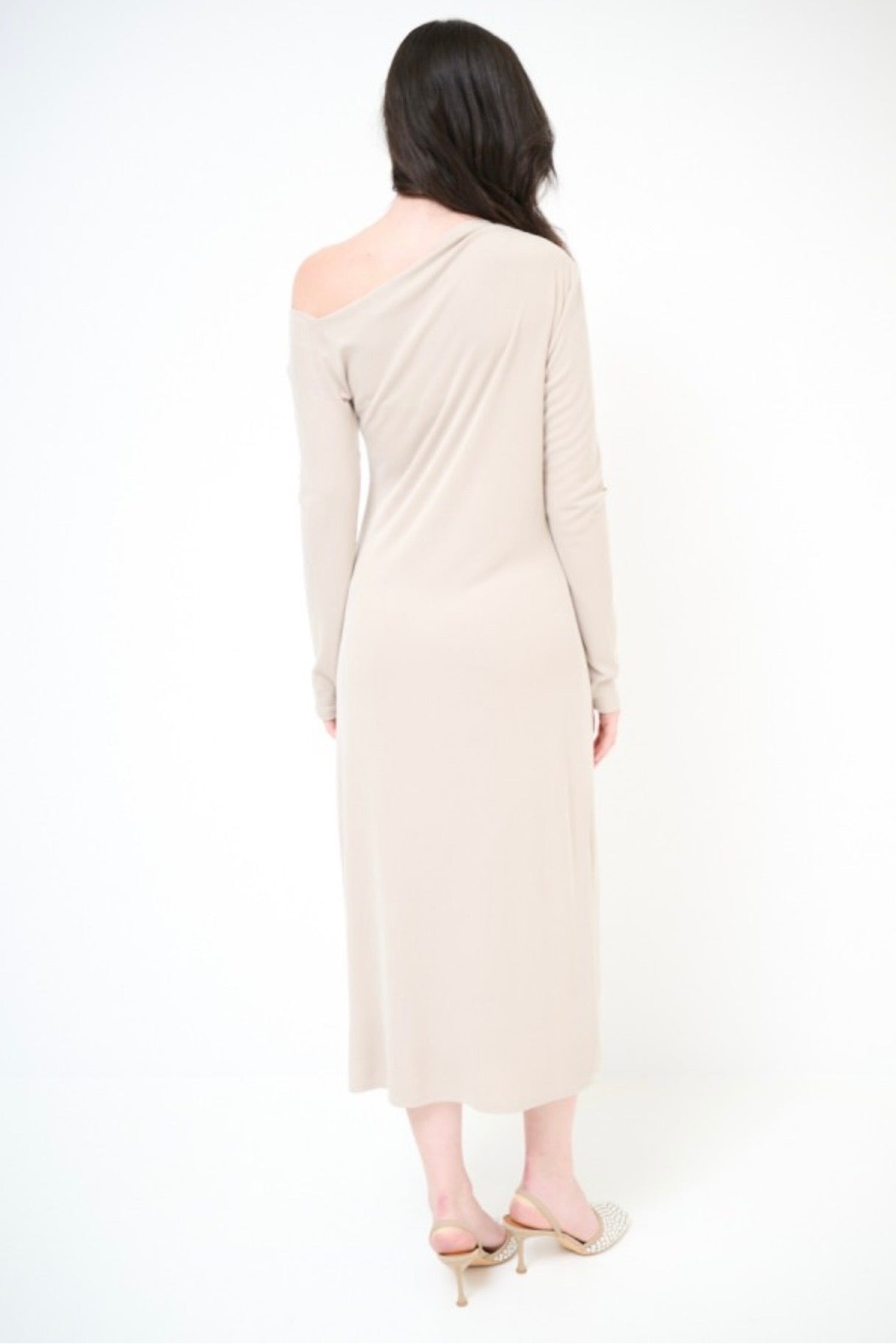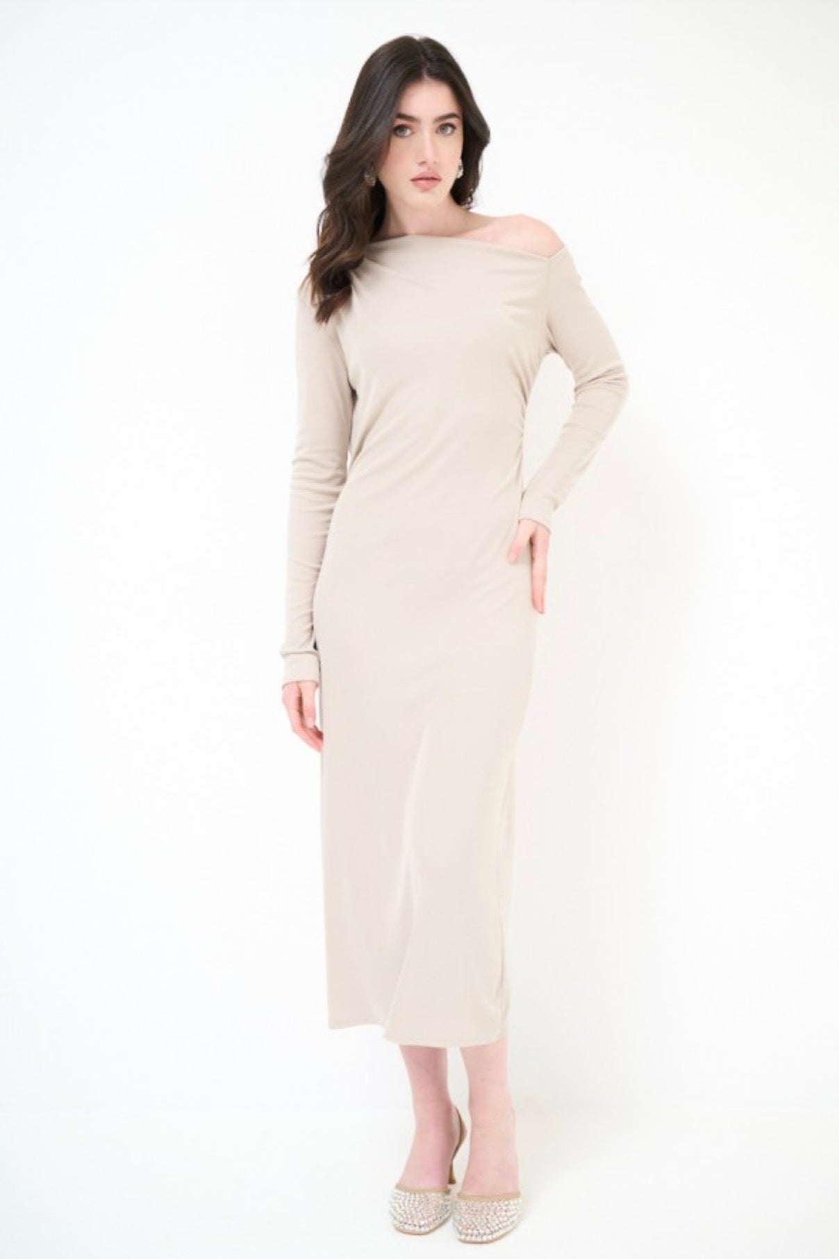 Béžové dlouhé viskózové šaty z ramene