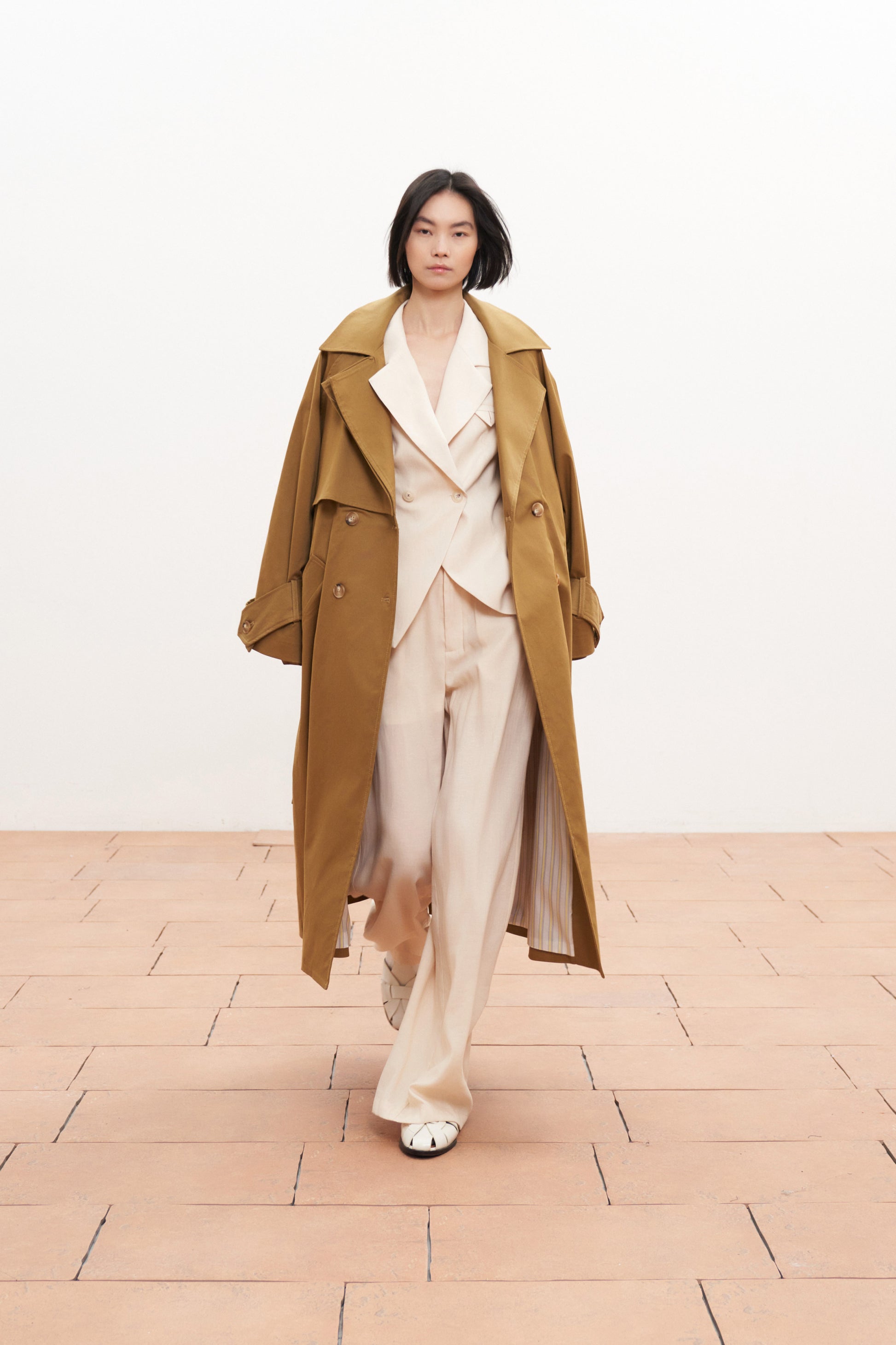 Dlouhý béžový bavlněný trenčkot s vázáním