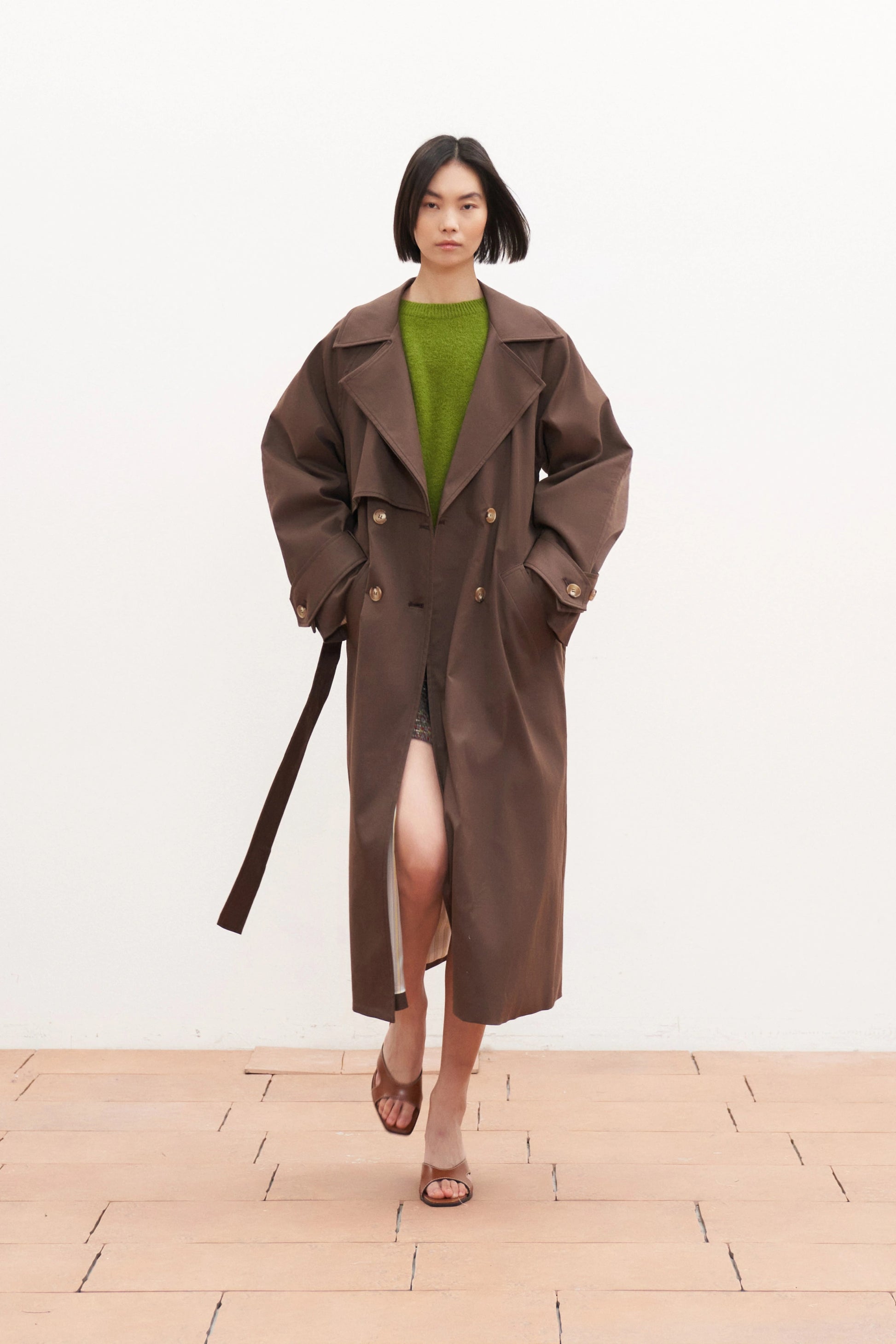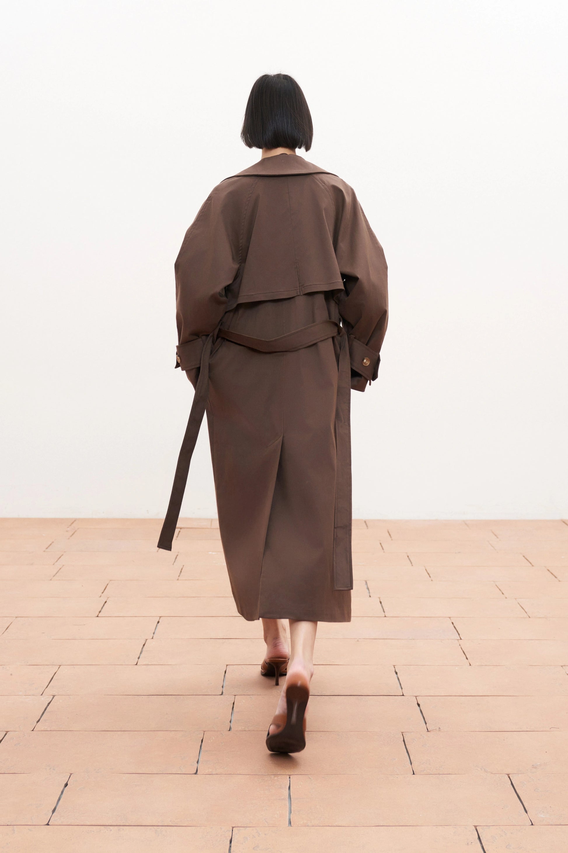 Snížit množství produktu Dlouhý hnědý bavlněný trenčkot s vázáním