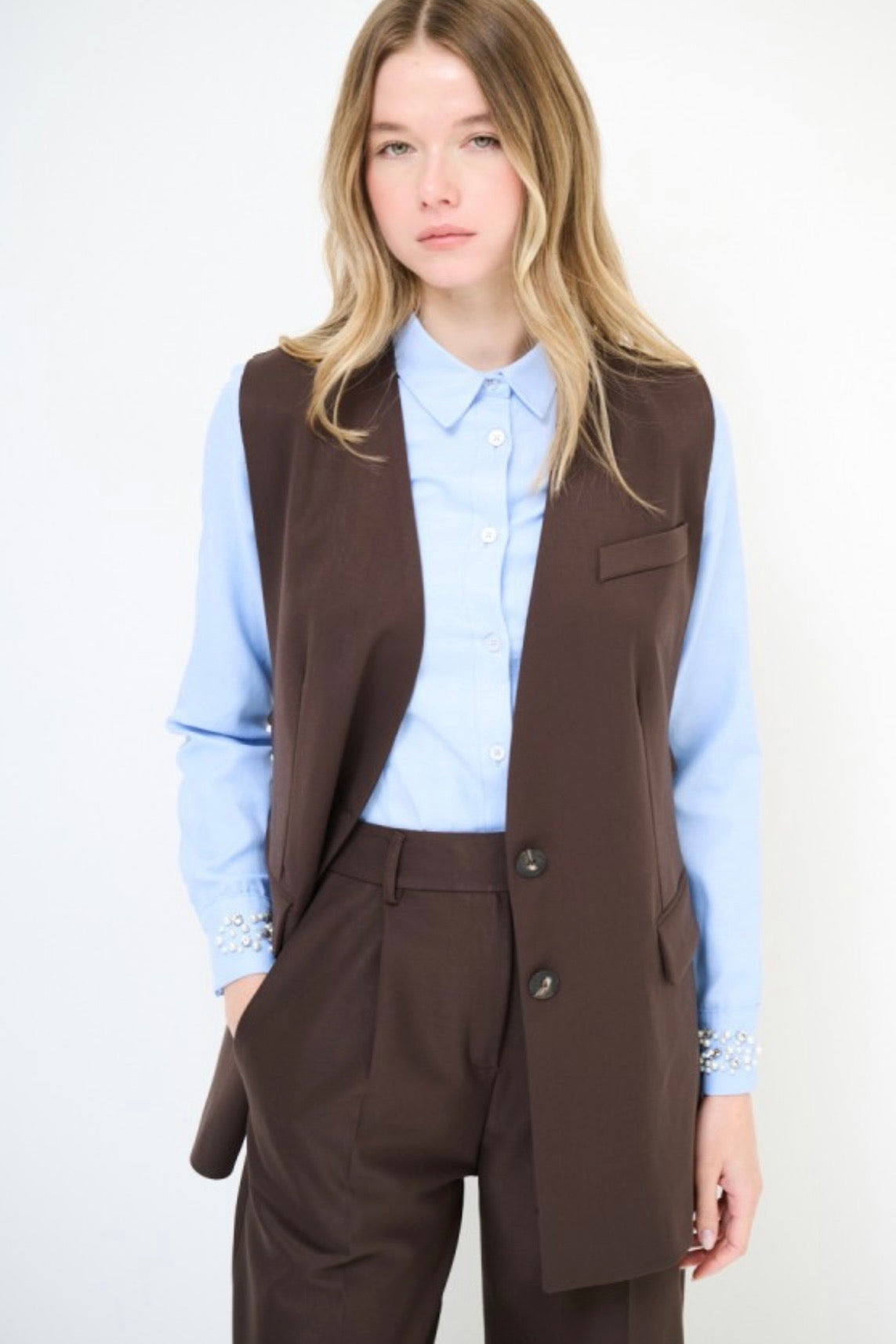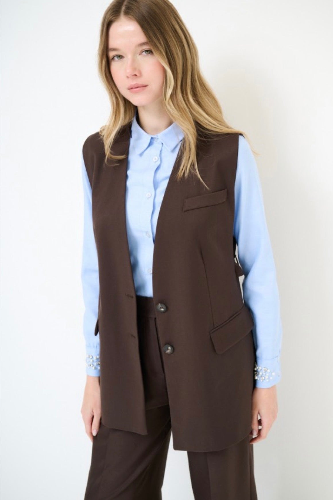 Snížit množství produktu Dlouhá vypasovaná hnědá vesta