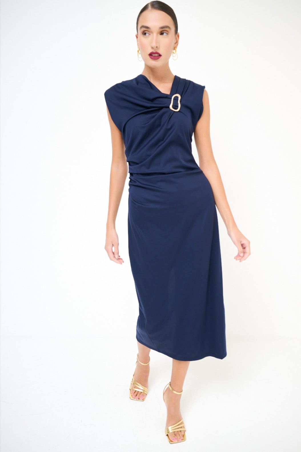 Modré šaty s kovovým doplňkem