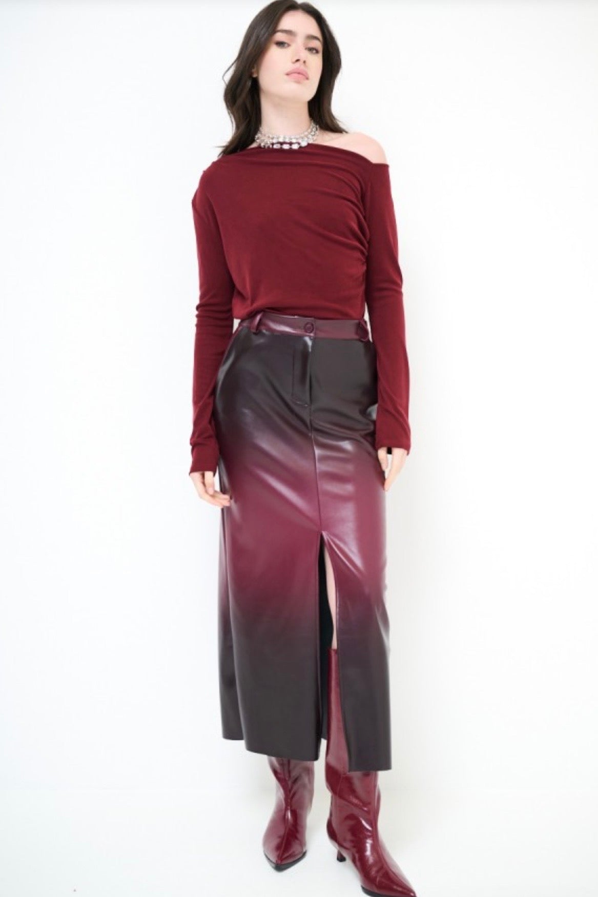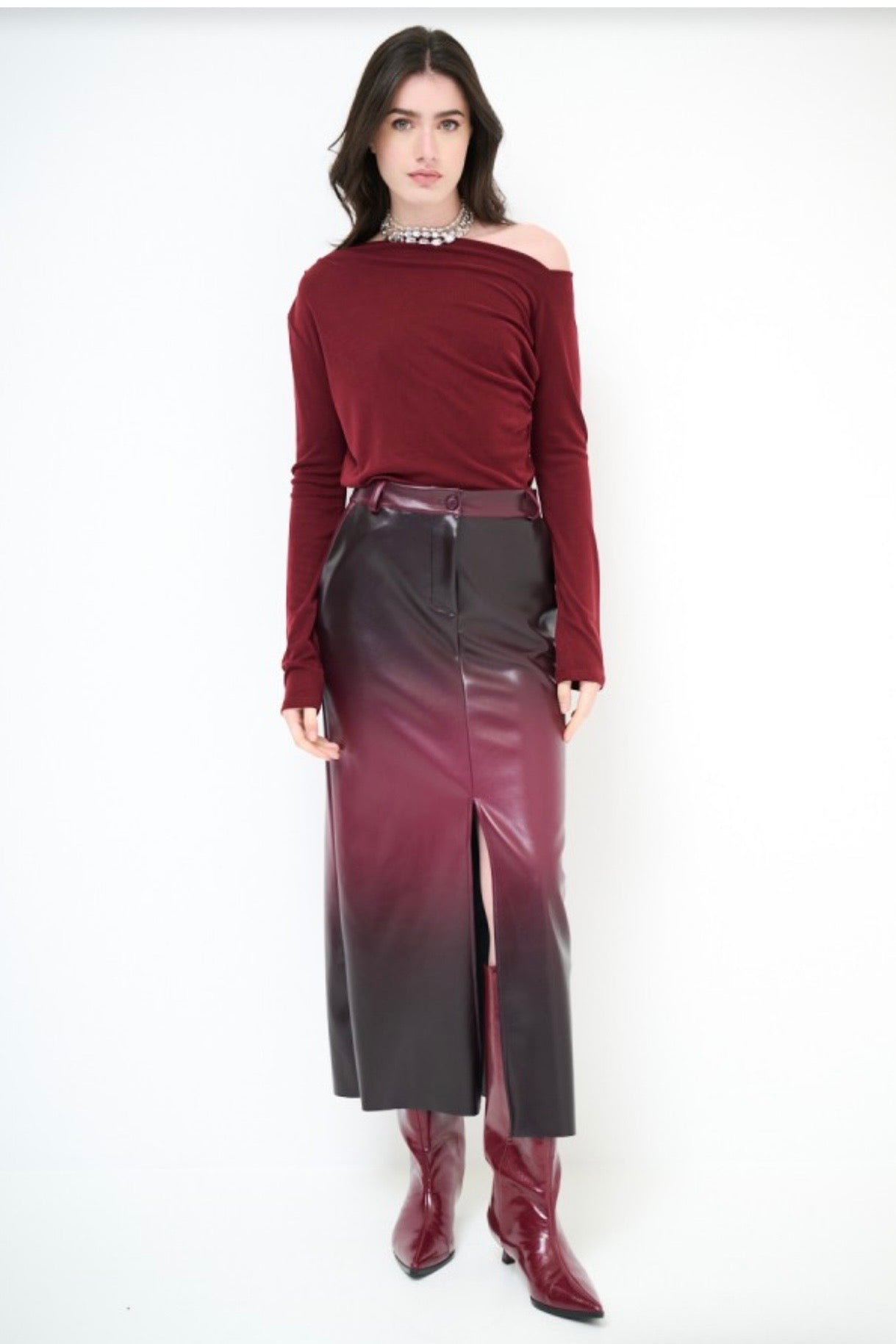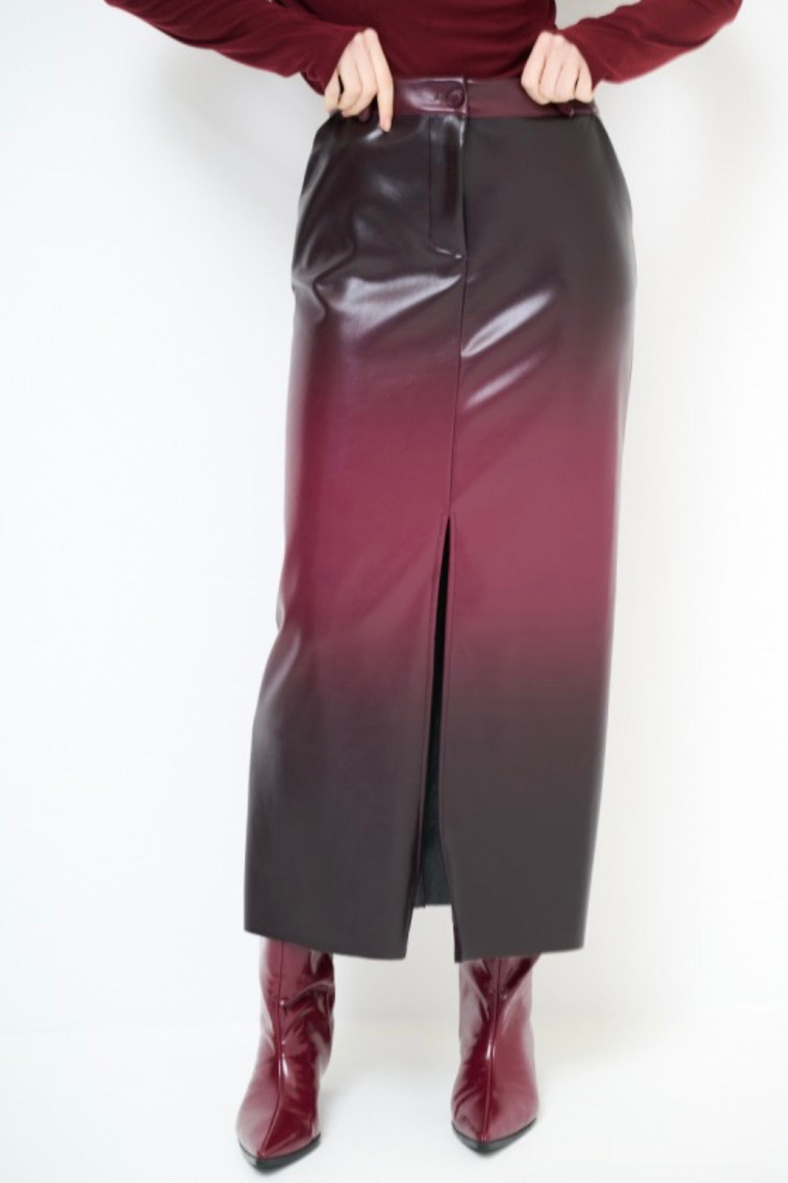 Vínová dvoubarevná sukně z eko kůže
